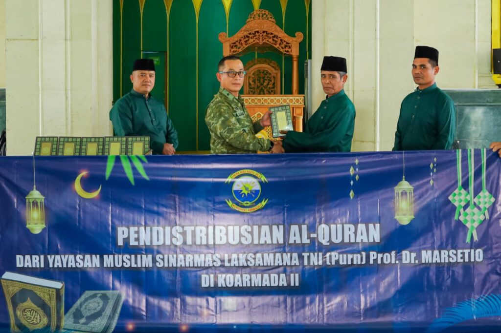 Panglima Komando Armada II Laksda TNI I G. P. Alit Jaya, S.H., M.Si., melaksanakan pendistribusian Al-Qur’an dari Yayasan Muslim Sinar Mas kepada prajurit di jajaran Koarmada II, bertempat di Masjid Al-Mahdi Koarmada II dan KRI Brawijaya-320, Senin (9/3). Kegiatan ini merupakan bagian dari program penyerahan 1.000 Al-Qur’an yang diinisiasi oleh Ketua Umum Yayasan Muslim Sinar Mas Laksamana TNI (Purn) Prof. Dr. Marsetio kepada jajaran TNI Angkatan Laut.