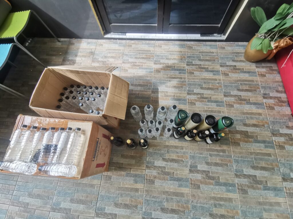 Selain itu Polisi juga menyita berbagai jenis minuman beralkohol, mulai dari produk impor hingga puluhan botol arak Bali yang dikemas dalam botol air mineral.