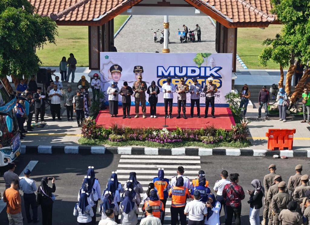 yang mengantar 1.400 pemudik dalam program mudik gratis Lebaran 2026. Pemberangkatan dilakukan langsung oleh Bupati Sidoarjo, Subandi di Pendopo Delta